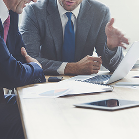 Businessmen working together on a laptop.