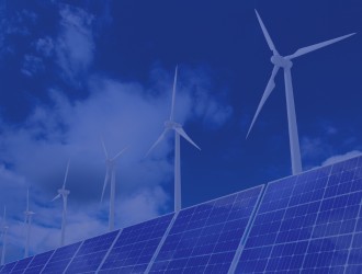 wind turbines and solar panels in front of blue skies; there is a blue overlay over the image