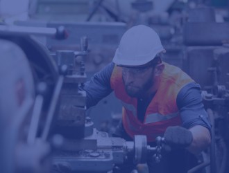 worker in safety vest and hard hat operating a machine; there is a blue color overlay over the image