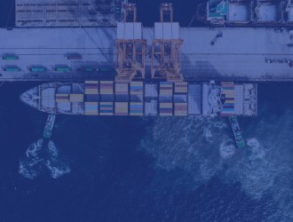 cargo ship at dock being loaded with shipping containers; there is a blue overlay over the image